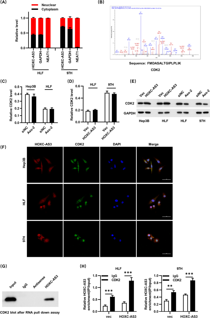 (A)HOXC-AS3的亚细胞定位;(B)质谱分析的CDK2肽段;(C–D)qRT-PCR显示HOXC-AS3不影响CDK2转录;(E)Western blot显示HOXC-AS3影响CDK2蛋白水平;(F)FISH显示HOXC-AS3与CDK2共定位;(G)RNA pull-down结果;(H)RIP结果。
