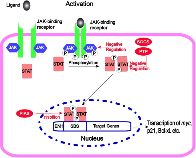 JAK-STAT(Janus激酶-信号转导与转录激活因子)通路是介导细胞因子、生长因子信号的关键 intracellular cascade,参与造血、免疫调节、胚胎发育等生理过程。通路核心组件包括4种JAK酪氨酸激酶(JAK1-3、Tyk2)和7种STAT转录因子(STAT1-6,含STAT5a/b),激活过程为“配体结合受体→JAK磷酸化→STAT二聚化核转位→靶基因转录”。负调控因子(如SHP1/2酪氨酸磷酸酶、PIAS家族蛋白、SOCS家族蛋白)通过去磷酸化、阻断DNA结合或促进泛素化降解维持通路平衡。