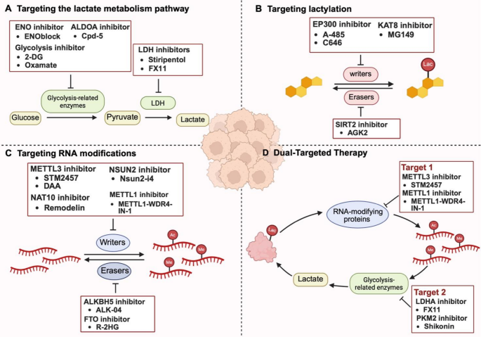本文系统阐明了乳酸化与RNA修饰的串扰机制,揭示了“代谢重编程→表观调控→转录后调控”的恶性循环,为肿瘤治疗提供了新的靶点(如NSUN2、METTL1、IGF2BP3)。未来研究需聚焦: