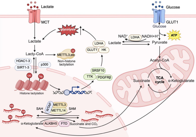 本文作为综述性研究,围绕“乳酸化调控RNA修饰→RNA修饰调控乳酸化→两者形成正反馈环路”的逻辑展开,结合具体研究案例解析分子机制,最终总结治疗潜力。研究核心是揭示“代谢重编程(乳酸产生)→表观调控(乳酸化)→转录后调控(RNA修饰)→代谢重编程”的恶性循环,为阻断肿瘤恶性进展提供靶点。