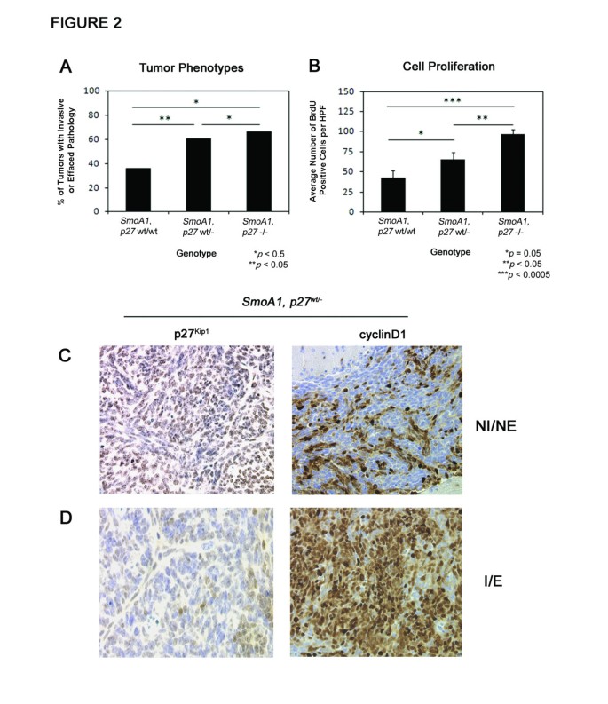 实验目的是探讨p27 Kip1缺失对髓母细胞瘤进展的影响。方法上,对上述小鼠的肿瘤进行病理分级(非侵袭/无结构破坏、侵袭/结构破坏),并通过溴脱氧尿苷(BrdU)脉冲标记(100 mg/kg腹腔注射1小时后处死)结合免疫组化,检测肿瘤细胞增殖指数(计数5个高倍视野的BrdU阳性细胞数)。结果显示,SmoA1+p27wt/-小鼠中60.5%的肿瘤表现为侵袭/结构破坏,显著高于野生型(36.0%,p=0.04);SmoA1+p27-/-小鼠中这一比例为66.7%(p=0.08,接近显著)。增殖指数分析显示,SmoA1+p27wt/-和SmoA1+p27-/-肿瘤的BrdU阳性细胞数显著高于野生型(p=0.05和p=0.0001)。免疫组化进一步显示,进展期肿瘤(侵袭/破坏)中p27 Kip1表达降低,而cyclinD1(细胞周期促进因子)表达升高。