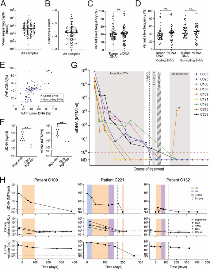 实验目的是评估ctDNA与临床结局的相关性,并对比常规标志物性能。方法细节:①按高危/非高危分组分析诊断时ctDNA水平;②纵向监测治疗中ctDNA变化;③对比复发与无复发患者的ctDNA状态;④将ctDNA与5种常规标志物(血清NSE、嗜铬粒蛋白A,尿多巴胺、高香草酸(HVA)、香草扁桃酸(VMA))的敏感性比较。结果解读:①诊断时,高危患者的cfDNA/ctDNA水平显著高于非高危患者(P=0.009,Mann-Whitney检验);②有效治疗期间,ctDNA逐步下降(如高危患者诱导化疗后ctDNA明显降低);③无复发患者的23份随访样本中,ctDNA均为阴性(0假阳性);④4次复发均伴随ctDNA升高,其中1例患者的ctDNA在复发前78天转为阳性,水平升高1500倍(复发时所有SNVs均阳性);⑤ctDNA比常规标志物更敏感——诊断时ctDNA高于参考值(1 MTM/ml)的倍数(10^4-10^6倍)远高于常规标志物(仅数倍),复发时ctDNA更早升高(早于影像学78天)。