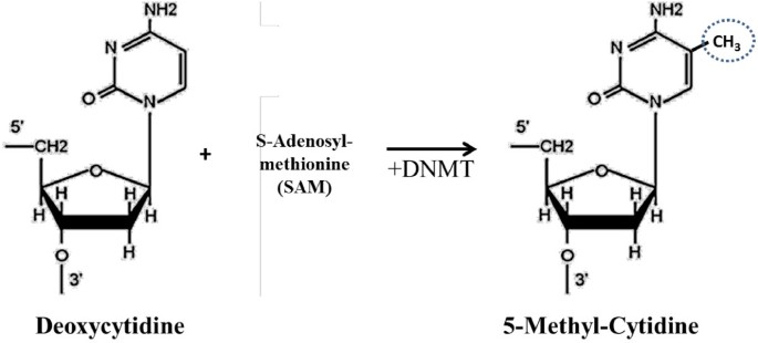 (图1:DNA甲基化的生化过程——甲基转移酶(DNMT)将S-腺苷甲硫氨酸(SAM)的甲基转移至胞嘧啶的5号碳,形成5-甲基胞嘧啶。)