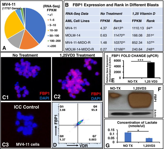 结果解读:RNA-seq显示,MV4-11细胞基因表达呈饼状分布(图1A);与未处理组相比,1,25VD3处理组FBP1的FPKM排名从“低水平(NO-TX组)”急剧上升至“高水平(1,25VD3组)”(图1B),且这一趋势在MOLM-14细胞及耐药株中一致,提示FBP1是维生素D调控的关键差异基因。
