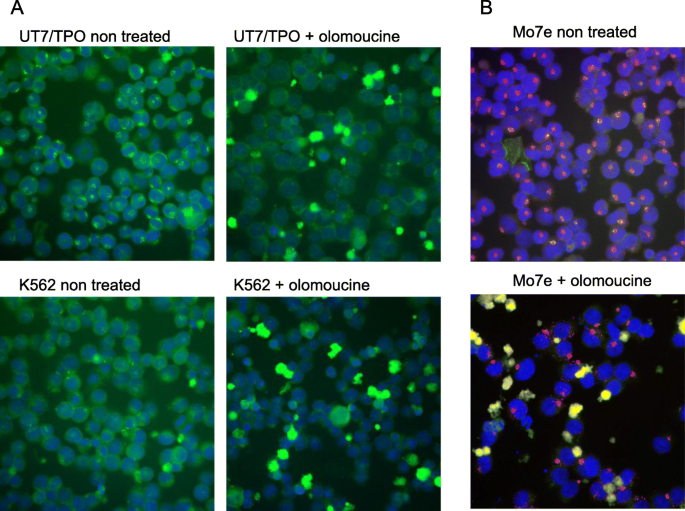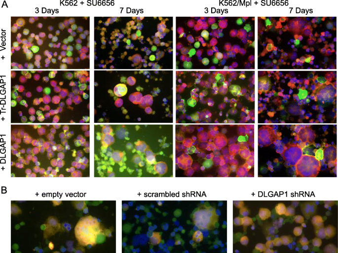 方法:用JAK2抑制剂AG490、SRC抑制剂SU6656、MAPK抑制剂U0126处理UT7/TPO、HEL、K562细胞,免疫荧光检测DLGAP1定位变化。