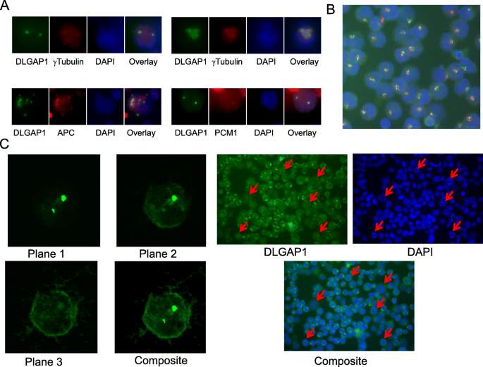 方法:用免疫荧光染色检测DLGAP1与中心体标记物(γ-微管蛋白、APC)、PCM1(中心体卫星蛋白)的共定位,使用K562、UT7/TPO、HEL等细胞系。