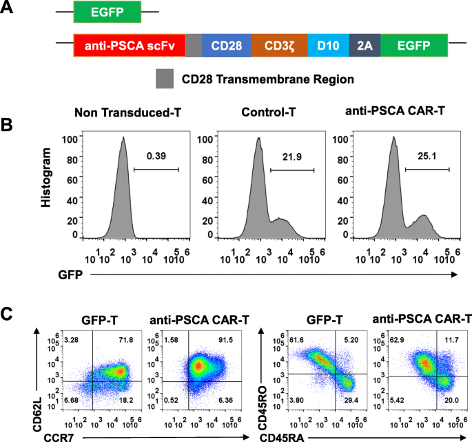实验目的是构建表达PSCA特异性CAR的T细胞并鉴定其表型。方法从健康供者外周血分离外周血单个核细胞(PBMC),通过负性选择获得原代T细胞,用CD3/CD2/CD28微珠激活48小时后,转导含抗PSCA单链可变片段(scFv,源自人源化IG8抗体)、CD28和DAP10共刺激域的第三代慢病毒载体;通过流式细胞术检测CAR表达(基于GFP阳性比例)及T细胞表型(CCR7、CD62L、CD45RA/RO等)。结果显示,慢病毒转导后T细胞GFP阳性率提示CAR成功表达,且T细胞呈现CD45RO⁺CCR7⁺CD62L高表达表型(中央记忆T细胞,提示可持续抗肿瘤潜力)。实验所用关键产品:T细胞分离用Miltenyi Biotec的Pan-T Isolation Kit,激活用Miltenyi Biotec的抗人CD3/CD2/CD28微珠,慢病毒包装用Sigma-Aldrich的聚乙烯亚胺(PEI)。