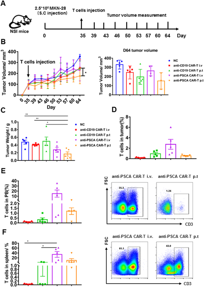 实验目的是验证抗PSCA CAR-T细胞在体内的抗肿瘤效果及给药方式的影响。方法构建两种胃癌皮下异种移植模型:BGC-823模型(5×10⁵肿瘤细胞注射,肿瘤可触及时给药)和MKN-28模型(2.5×10⁶肿瘤细胞注射,肿瘤达100 mm³时给药),用NSI小鼠(NOD-SCID-IL2Rg⁻/⁻),分别通过静脉注射或瘤周注射给予2.5×10⁶抗PSCA CAR-T细胞或GFP-T细胞,每周两次测量肿瘤体积,3周后评估肿瘤重量及T细胞浸润情况。结果显示,瘤周注射抗PSCA CAR-T细胞组的肿瘤体积显著小于GFP-T组及静脉注射组(BGC-823模型中,瘤周注射组肿瘤重量显著降低,P<0.05;MKN-28模型中,瘤周注射组肿瘤生长抑制更明显);T细胞浸润检测显示,瘤周注射组肿瘤内T细胞比例略高于静脉注射组,但无统计学差异(文献未明确具体数值)。实验所用关键产品:实验动物为NSI小鼠(广州生物医药与健康研究院构建),肿瘤细胞注射用Gibco的PBS。