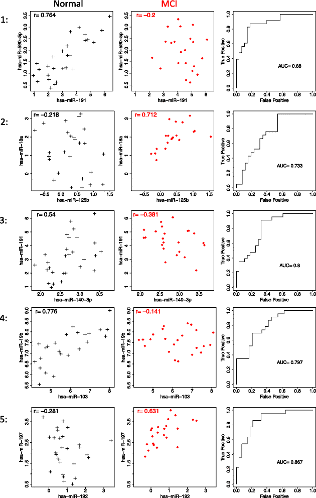 Biomarker来源为“MCI患者与对照的血浆样本”;验证方法包括“实时定量PCR(qPCR)检测miRNA表达水平,差异相关分析筛选相关性差异显著的miRNA对,含交互项的逻辑回归模型评估其对MCI的鉴别能力,ROC分析计算AUC值”;特异性与敏感性数据:最优miRNA对组合(miR-191&miR-101、miR-103&miR-222)的AUC值达0.962(文献未明确提供95%置信区间、敏感性与特异性数据),显著高于传统t检验筛选的标志物(平均AUC 0.784)。