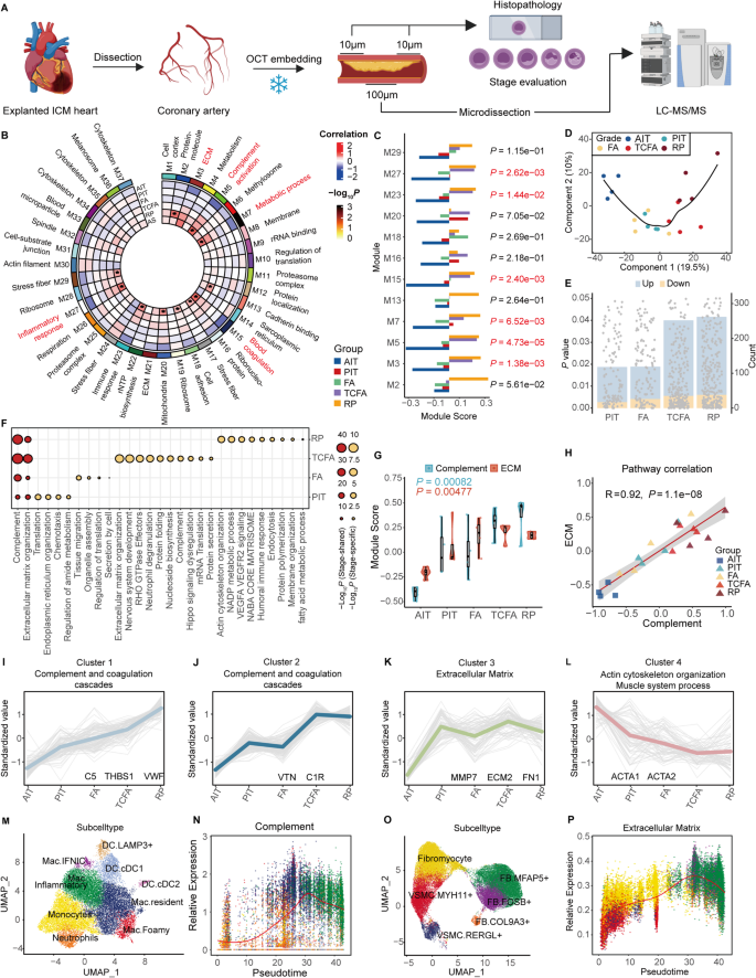 图1 冠状动脉粥样硬化不同病理阶段的蛋白质组学与组织病理学分析。A. 样本获取与分析 workflow;B. WGCNA蛋白共表达模块与病理阶段的关联;C. 关键模块的阶段特异性得分;D. PLS-DA的阶段区分;E. 各阶段与AIT的差异蛋白数量;F. 通路富集分析;G. 补体与ECM通路的ssGSEA得分;H. 通路活性相关性;I-L. K-means聚类的4个簇;M-N. 巨噬细胞亚型的补体通路拟时序分析;O-P. 成纤维细胞/平滑肌细胞的ECM通路拟时序分析