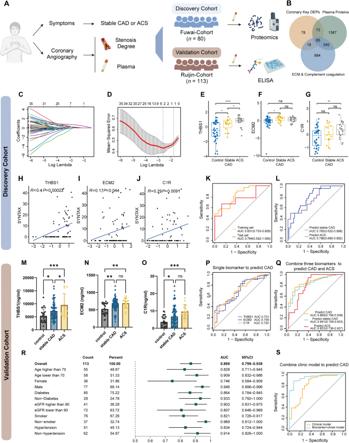 图2 冠状动脉疾病生物标志物的发现与验证。A. 生物标志物筛选与验证的 study design;B. 组织与血浆蛋白的重叠策略;C-D. LASSO回归的系数与Lambda选择;E-G. 发现队列中THBS1、ECM2、C1R的水平差异;H-J. 与SYNTAX评分的相关性;K. 训练集与测试集的ROC曲线;L. 发现队列的亚组ROC曲线;M-O. 验证队列中的水平差异;P. 单一 biomarker 的ROC曲线;Q. 验证队列的组合 biomarker ROC曲线;R. 亚组分析的AUC值;S. 生物标志物+临床模型的ROC曲线
