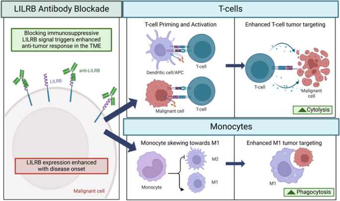 方法细节:通过细胞共培养实验(如AML细胞与T细胞/NK细胞共培养)、基因敲除(如LILRB4 KO AML细胞系)及动物模型(如PDX小鼠),研究LILRB对免疫细胞功能的影响;采用免疫沉淀、Western blot检测LILRB的信号通路(如NF-κB、AKT/mTOR)。