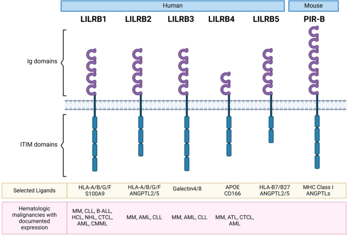 血液系统恶性肿瘤(如白血病、淋巴瘤、骨髓瘤)的免疫逃逸是其进展的核心特征,恶性细胞通过调控免疫微环境、沉默宿主免疫细胞实现免疫逃避。免疫检查点抑制剂(如PD-1/PD-L1抑制剂)的成功推动了对抑制性免疫受体的研究,但血液瘤中多数抑制性受体的作用仍未完全阐明。 leukocyte immunoglobulin-like receptor B(LILRB)家族是一类表达于髓系和淋巴系细胞的抑制性免疫受体,通过免疫受体酪氨酸-based抑制基序(ITIM)传递抑制信号,维持免疫稳态。既往研究提示LILRB家族参与血液瘤的发生发展,但其在不同血液瘤中的预后价值、调控机制及治疗潜力尚未系统整合。针对这一空白,本文通过系统综述LILRB家族在血液瘤中的预后关联、免疫微环境调控机制及治疗靶点进展,填补了现有研究对LILRB家族多维度作用的认知缺口,为血液瘤的精准诊断和免疫治疗提供了新视角。