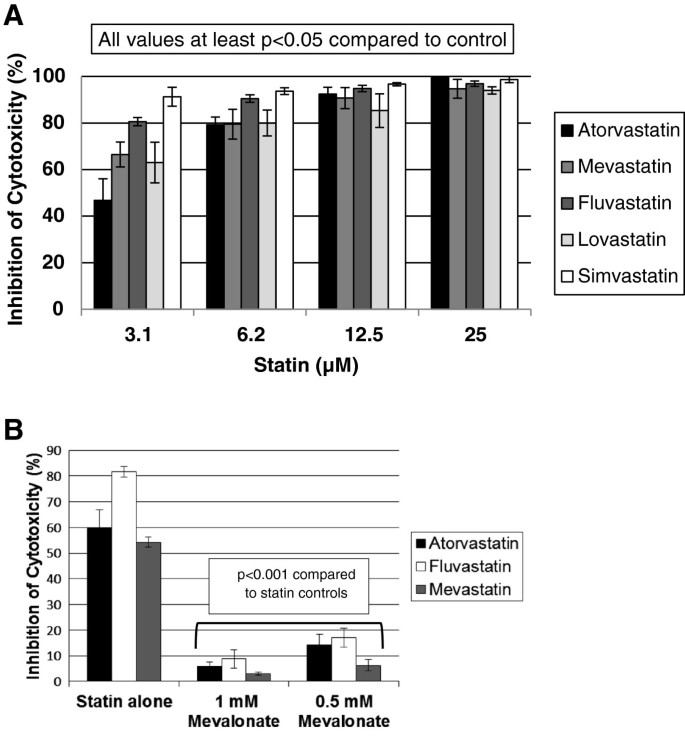 方法细节:用25μM-3.1μM的阿托伐他汀、美伐他汀、氟伐他汀、洛伐他汀或辛伐他汀处理YT-INDY细胞24小时,随后与51铬标记的Phebo靶细胞按40:1比例共孵育4小时,检测上清放射性,计算杀伤率(%lysis);部分样本联合甲羟戊酸(0.5mM或1mM)共处理。