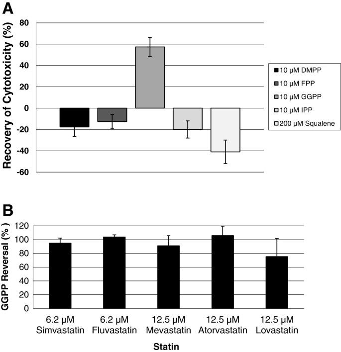 方法细节:用12.5μM洛伐他汀处理YT-INDY细胞,同时加入10μM的香叶基香叶基焦磷酸、二甲基烯丙基焦磷酸、法尼基焦磷酸、异戊烯基焦磷酸或200μM角鲨烯,培养24小时后检测细胞毒性;对照组用药物溶剂处理。