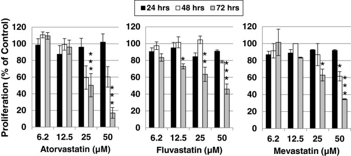 方法细节:将YT-INDY细胞(1×10^5/ml)接种于25cm²培养瓶,加入不同浓度(6.2μM-50μM)的阿托伐他汀、氟伐他汀、美伐他汀或辛伐他汀(仅50μM),或联合甲羟戊酸(1mM)、香叶基香叶基焦磷酸(10μM)共处理,培养72小时,每24小时计数;对照组用药物溶剂(如DMSO)处理。