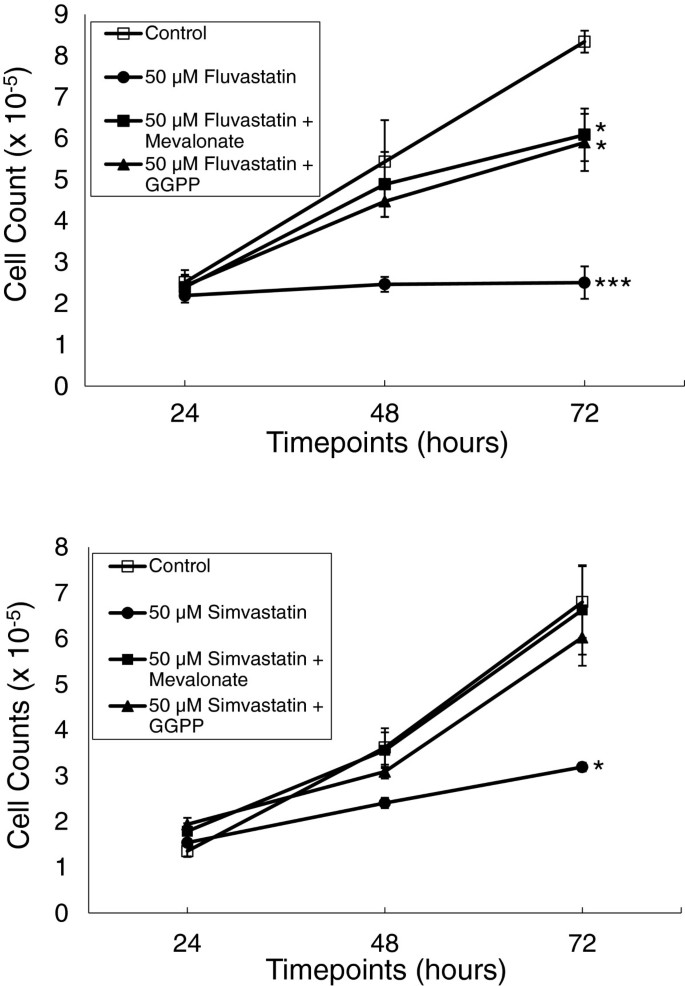 结果解读:他汀类药物呈剂量和时间依赖性抑制增殖(图2):如50μM辛伐他汀处理72小时后,细胞计数较对照组减少约60%(n=4,p<0.001);甲羟戊酸和香叶基香叶基焦磷酸可部分逆转抑制作用(图1):辛伐他汀+甲羟戊酸组的细胞计数与对照组无显著差异(n=3,p>0.05),辛伐他汀+香叶基香叶基焦磷酸组的增殖抑制率较辛伐他汀组降低约30%(n=3,p<0.05)。
