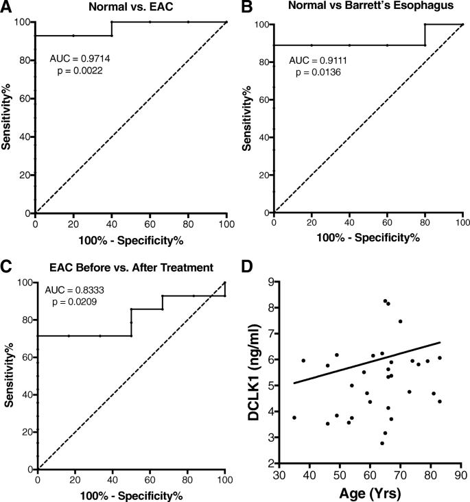 血清DCLK1的来源为不同疾病阶段患者的外周血血清——正常对照来自上消化道内镜正常者,BE患者来自伴低/高度不典型增生的巴雷特食管患者,EAC治疗前患者来自I/II期食管腺癌患者,EAC治疗后患者来自上述EAC患者治疗结束时的血清。验证方法为ELISA定量检测,通过标准曲线准确计算血清DCLK1浓度。特异性与敏感性数据方面,DCLK1区分EAC与正常对照的AUC为0.971(提示高敏感性和特异性),区分BE与正常对照的AUC为0.911,区分EAC治疗后与治疗前的AUC为0.833。