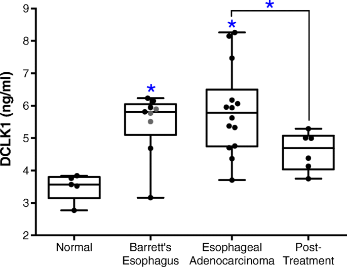 Biomarker定位:本研究关注的生物标志物为血清DCLK1,属于循环蛋白类生物标志物。其筛选逻辑基于此前研究发现DCLK1在BE伴HGD或EAC中高表达,且为癌症干细胞标志物;验证逻辑为通过“正常对照→BE→EAC治疗前→EAC治疗后”的梯度分组,结合ELISA定量检测与统计分析,验证DCLK1与疾病状态及治疗反应的关联。
