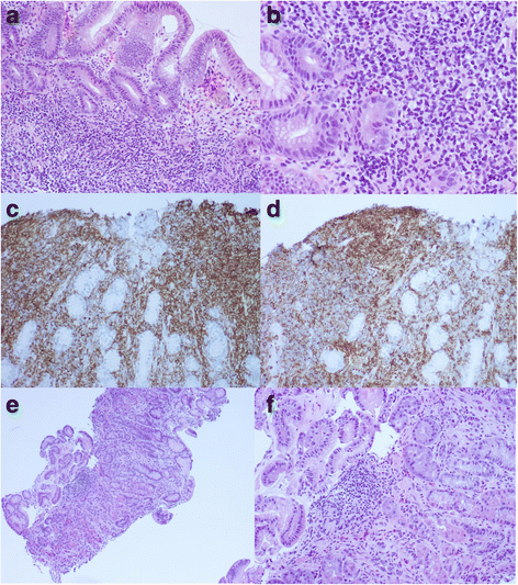 实验目的是总结胃MALT淋巴瘤的诊断流程与关键要点。方法细节包括:临床症状评估(消化不良、上腹痛等);内镜检查观察黏膜增厚、溃疡等改变;多部位活检(每个部位至少2块组织,分别固定);病理组织学分析(HE染色观察淋巴浸润与淋巴上皮病变);免疫组化(CD20、CD43等染色识别B细胞浸润与异常表达);分子检测(FISH检测API2/MALT1融合基因、PCR检测IgH基因重排)。结果解读:临床症状无特异性,内镜下黏膜改变需结合活检;病理中“致密、单一形态的小淋巴细胞浸润”“淋巴上皮病变(淋巴细胞浸润腺体并破坏结构)”是诊断关键;免疫组化显示CD20+ B细胞浸润伴CD43异常表达支持诊断;API2/MALT1融合基因阳性病例占20%,提示对H. pylori根除治疗反应差(22% vs 78%,P<0.05)。产品关联:文献未提及具体实验产品,领域常规使用免疫组化抗体(如CD20、CD43)、FISH探针(API2/MALT1)及PCR试剂盒(IgH基因重排)。