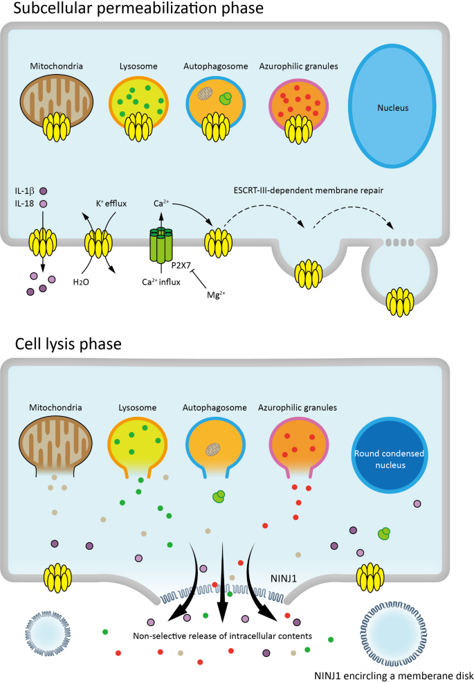 结果解读:焦亡分为可逆的亚细胞透化阶段(细胞器膜穿孔、炎症因子释放)和不可逆的细胞裂解阶段(质膜破裂、内容物释放)。亚细胞透化阶段的修复机制为临床干预提供了潜在靶点。