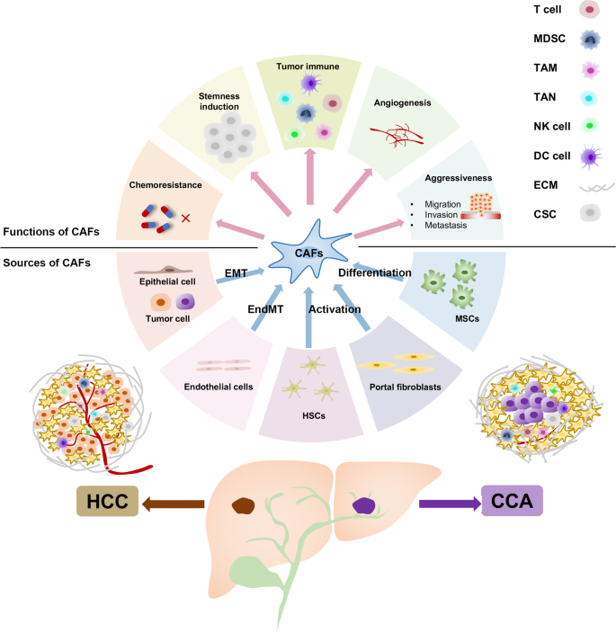 本文为综述性研究,整体框架为:以“CAFs的起源→功能→与TME的相互作用”为主线,结合近年scRNA-seq、谱系追踪等技术,总结CAFs在HCC和CCA中的作用机制。核心科学问题是CAFs在肝癌进展中的功能异质性及分子机制,技术路线为“回顾文献→整合数据→分析CAFs起源与功能→总结临床意义”。