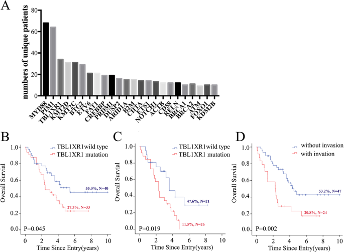 统计学结果:TBL1XR1突变与OS的关联在整体人群p=0.045(n=90)、CHOP方案人群p=0.019(n=66),与肿瘤浸润的关联p=0.025(n=90)。
