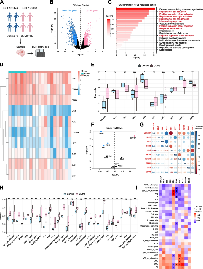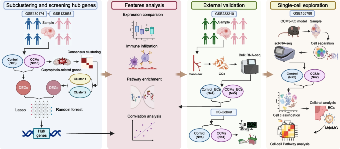 本研究以“揭示CCMs中铜死亡相关的免疫浸润景观及关键调控基因”为目标,围绕“铜死亡如何通过免疫浸润调控CCMs发病”的核心科学问题,采用“bulk RNA-seq分亚型→差异基因与免疫浸润分析→机器学习筛hub基因→实验验证→单细胞解析细胞通讯”的闭环技术路线,系统解析了CCMs中铜死亡与免疫浸润的关联及分子机制。