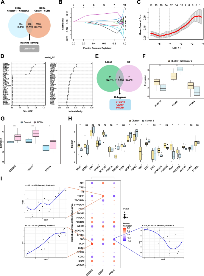 结果解读:筛选出3个 hub 基因(BTBD10、PFDN4、CEMIP):BTBD10与PFDN4在Cluster 1高表达,CEMIP在Cluster 2高表达;3个基因在CCMs中均显著高表达(P<0.05),且与CCMs致病基因(如DLL4、TGFB1)强相关(BTBD10与DLL4正相关,r=0.887,P<0.001)。