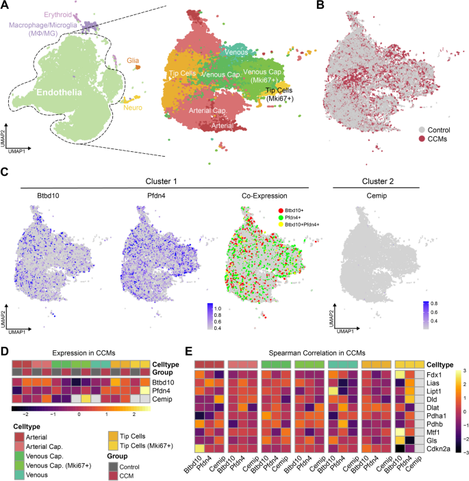 统计学结果:BTBD10与VE-cadherin共定位率85%(n=4,P<0.01);Western blot显示BTBD10蛋白水平在CCMs中是对照的3.2倍(n=4,P<0.01);PFDN4与ENG(内皮迁移基因)负相关(r=-0.725,P<0.001)。