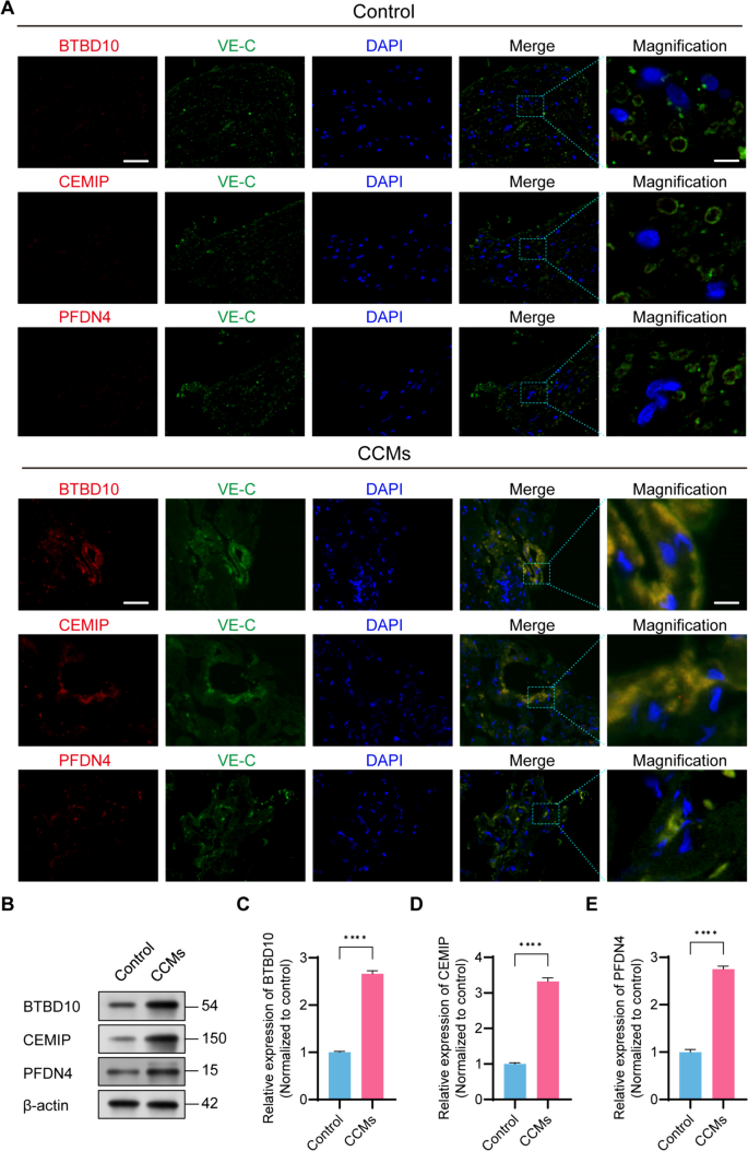 结果解读:外部数据集显示3个基因在CCMs EC中显著高表达(P<0.05);免疫荧光显示BTBD10、PFDN4、CEMIP与VE-cadherin共定位(共定位率>80%,P<0.01);Western blot显示CCMs中3个基因的蛋白水平是对照的2.5-3.2倍(P<0.01)。