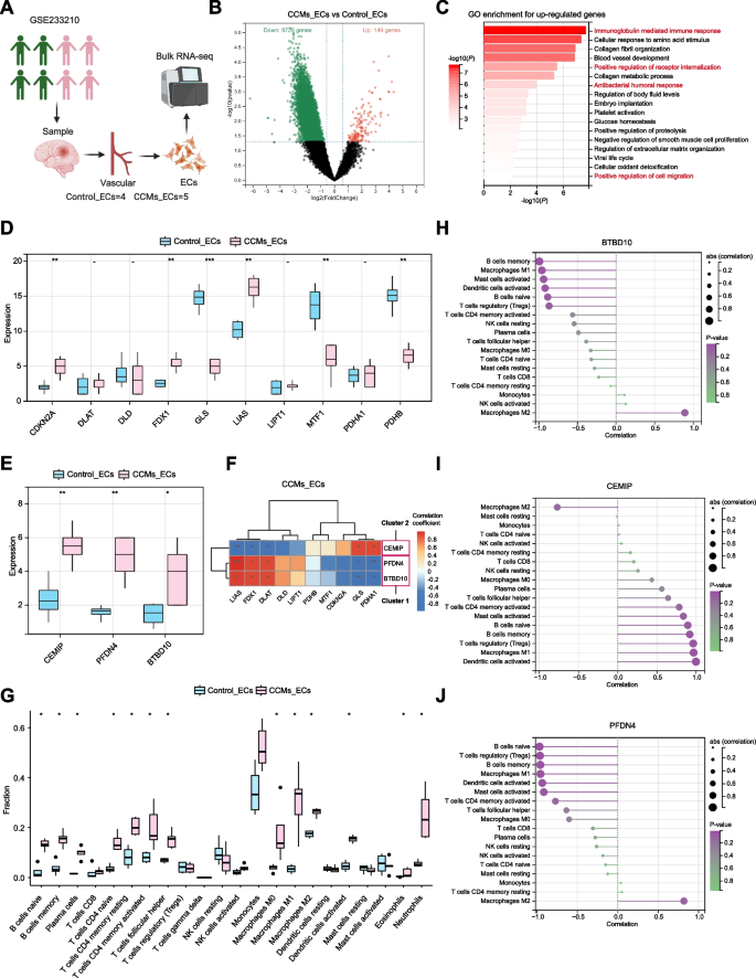 本研究的创新点在于:首次结合bulk和单细胞RNA-seq技术,解析CCMs中铜死亡相关的免疫浸润景观;通过机器学习筛选出3个 hub 基因(BTBD10、PFDN4、CEMIP);并通过实验验证其在血管内皮细胞(EC)中的表达及与M2巨噬细胞的通讯机制,为CCMs发病机制提供了“铜死亡-免疫浸润-血管异常”的新框架。