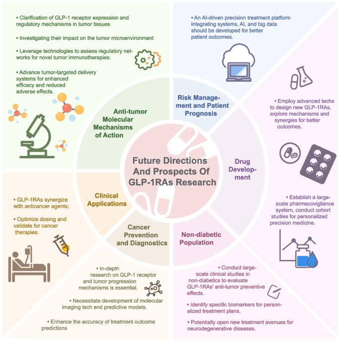 现有研究的局限性主要包括:(1)临床研究设计异质(如随访时间、患者基线特征差异)导致结果冲突;(2)基础研究多聚焦单一通路,缺乏对肿瘤微环境、免疫细胞相互作用的整合分析;(3)长期安全性数据不足(如GLP-1RAs使用超过3年的癌症风险数据有限)。本研究的创新之处在于:首次系统整合了“效应异质性-分子机制-药物对比-影响因素”的多维度数据,明确提出GLP-1RAs在癌症预防与治疗中的潜在角色,并针对“机制阐明、精准策略、非糖尿病人群应用”等方向提出未来研究重点,为GLP-1RAs向肿瘤领域的拓展提供了框架。