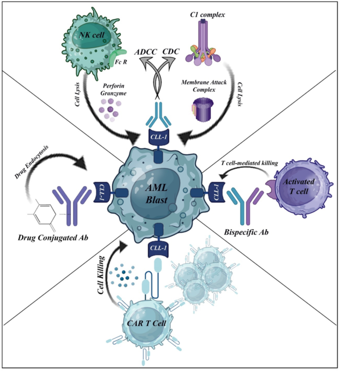 (图3:CLL-1靶向免疫治疗的机制,包括CAR-T细胞、ADC、双特异性抗体的作用模式)