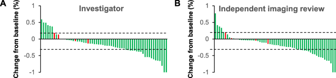 (图1:INV与IIR评估的肿瘤大小变化,红色代表因新病灶判定为PD的患者)