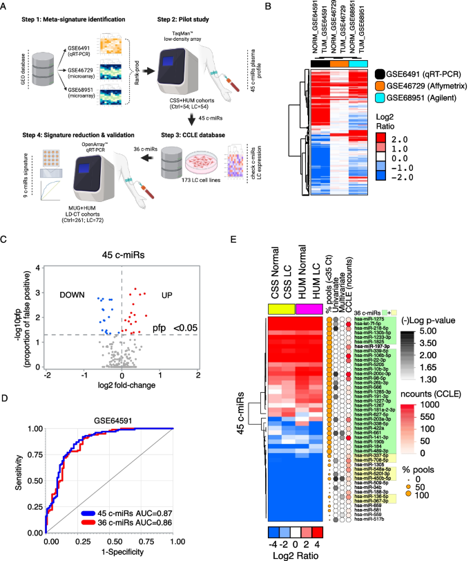 实验目的是从公共数据集和小样本中筛选差异显著且检测可靠的c-miR。方法细节:Step 1分析GSE64591、GSE46729、GSE68951三个数据集(150例肺癌、136例对照),用RankProd元分析(适应平台变异性)筛选45个差异c-miR(pfp<0.05);Step 2将54例肺癌、54例对照的血浆分为6个病例池和6个对照池,用qRT-PCR检测45个c-miR,筛选29个可靠标记(Ct<35且50%以上池中有表达);Step 3结合173个肺癌细胞系(CCLE数据库)的intracellular表达数据(确保肺癌特异性)和GSE64591的风险分析,补充7个c-miR,形成36-c-miR初步特征。结果解读:Step 1的45-c-miR在GSE64591中AUC=0.87(95%CI 0.83-0.92);Step 3的36-c-miR AUC=0.86(95%CI 0.81-0.91),稳定性提升。实验所用关键产品:文献未提及具体试剂,领域常规使用Qiagen miRNeasy Serum/Plasma Kit提取血浆RNA、TaqMan MicroRNA Assays检测miR。