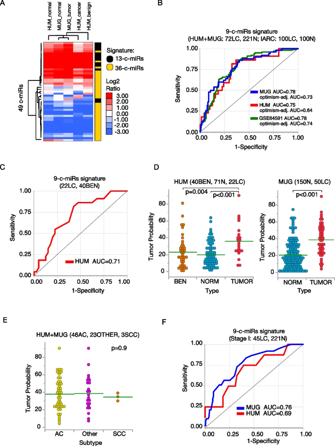 实验目的是在独立队列中验证36-c-miR特征的性能,并优化为更简洁的标记。方法细节:纳入MUG队列(72例肺癌、261例对照)和HUM队列(未明确样本量)的血浆样本,用OpenArray™ qRT-PCR单批次检测36个c-miR及13个外部特征(miR-Test),减少技术变异;通过逐步回归法在MUG队列中筛选出9个c-miR(结合3个housekeeping miR归一化),形成最终特征。结果解读:MUG队列中9-c-miR的AUC=0.78(敏感性76%、特异性67%、准确性70%);HUM队列AUC=0.75(敏感性82%、特异性68%、准确性71%);GSE64591独立验证AUC=0.78(95%CI 0.71-0.84),显示跨队列稳定性。此外,特征区分肺癌与良性结节的AUC=0.71(95%CI 0.58-0.84)。实验所用关键产品:OpenArray™ qRT-PCR平台(文献明确提及);其他试剂未提及,领域常规使用同类产品。
