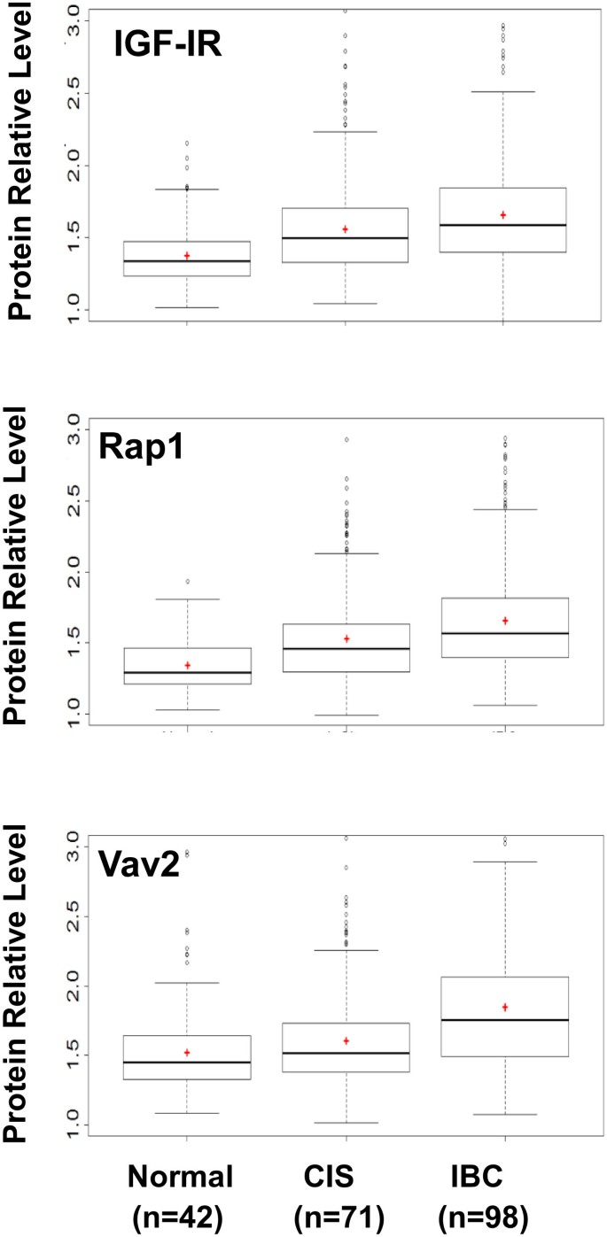 现有研究对三种候选蛋白的功能已有部分阐释:IGF-IR作为酪氨酸激酶受体,是癌症细胞增殖、迁移的关键驱动因子,其过表达与ER阳性乳腺癌的他莫昔芬耐药密切相关;Rap1是小GTP酶家族成员,与乳腺上皮细胞极性丧失、体外侵袭能力及裸鼠致瘤性有关;Vav2属于Vav家族鸟嘌呤核苷酸交换因子,可激活Rho家族GTP酶(如Rac1、Cdc42),促进细胞形态改变和迁移,在转移性乳腺癌中过表达,但在DCIS等早期乳腺癌中的表达特征及临床意义尚未明确。