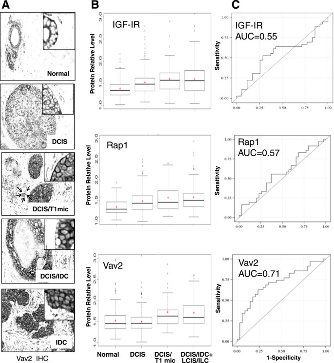 研究过程详述:Biomarker的来源为FFPE的正常乳腺上皮、DCIS、IBC样本;验证方法采用免疫组化(IHC)结合成像-based定量分析(相对像素强度),避免了传统IHC的主观偏差;特异性与敏感性方面,Vav2预测DCIS伴侵袭的AUC为0.71(95%CI 0.59-0.84),提示其具有中等预测能力(文献未明确提供敏感性和特异性的具体数值)。