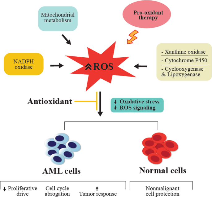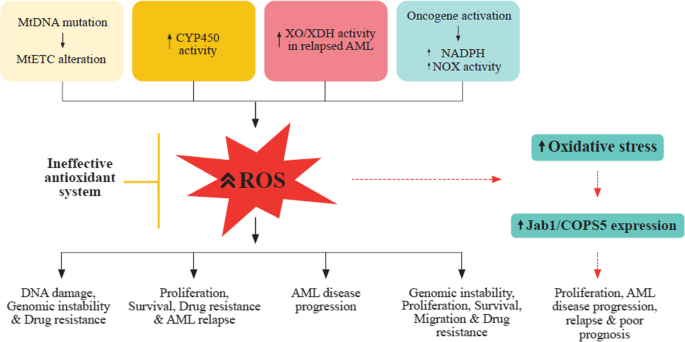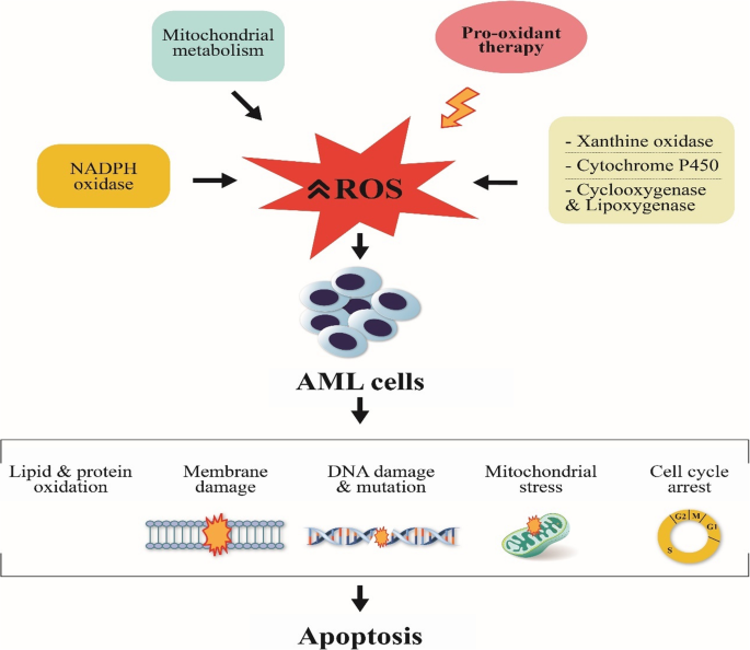 方法细节:作者回顾了线粒体代谢、NOX家族、酶类(XO、细胞色素P450)及致癌基因激活等途径的研究,包括AML细胞mtDNA突变实验、NOX2激活的原代细胞检测、复发AML患者XO活性测定,以及BCR-ABL/FLT3-ITD转基因小鼠的ROS水平分析。