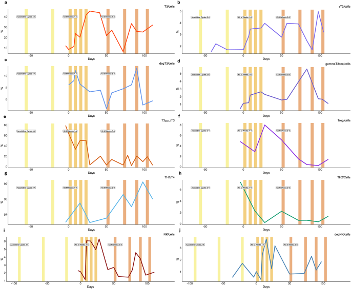 Biomarker来源为患者外周血(PB)样本,验证方法为流式细胞术(检测细胞表面/胞内标志物)。特异性与敏感性数据:(1)DCleu比例从治疗前的低水平(<5%)持续增加至治疗中期的峰值(约15%,补充图5);(2)IFN-γ+记忆γδ T细胞比例较治疗前增加约2倍(文献未明确具体数值,基于图表趋势推测);(3)PD-1+T细胞比例从治疗前的约30%降至治疗中的约10%(图1e);(4)调节性T细胞比例从治疗前的约15%降至约5%(图1f)。