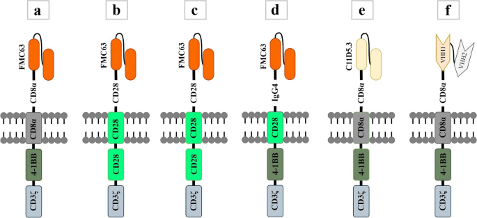 - 铰链:IgG4铰链易结合Fcγ受体(FcγR),引发巨噬细胞的吞噬作用(导致CAR-T清除),需通过突变(如删除CH2域)或截断(如仅保留铰链区)优化;CD8α铰链(长约27aa)适用于膜近端抗原(如CD20),CD28铰链(短约12aa)适用于膜远端抗原(如CD19)(图2展示了不同铰链的CAR结构)。