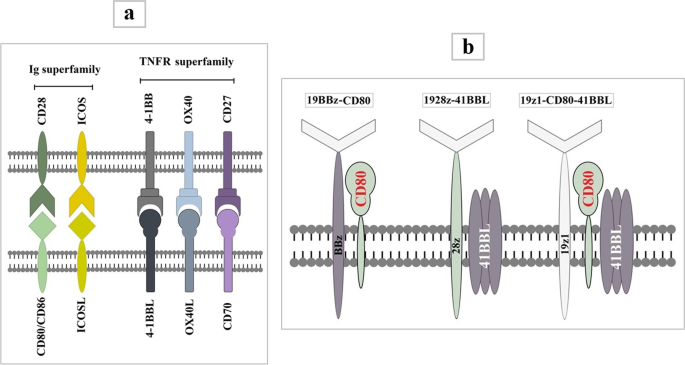 - 跨膜与内域:CD28跨膜域的CAR-T分泌更多IL-2(如比CD8α跨膜域高1.5倍,n=3,P<0.05),但PD-1表达水平显著升高(耗竭标志物);4-1BB共刺激域的CAR-T中,TCM比例较CD28组高2倍(n=5,P<0.01),体内持久性延长至12周(CD28组仅4周)(图3展示了共刺激域对T细胞表型的影响)。
