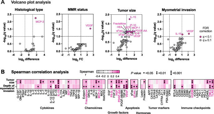 方法细节:① 提取病理特征:组织学类型(低级别EEC vs 其他EC)、肿瘤大小(≤2cm vs >2cm)、肌层浸润(有 vs 无)、MMR状态(缺陷 vs 正常);② 火山图:校正False Discovery Rate(q<0.1)后,比较组间蛋白水平;③ Spearman相关:分析蛋白与肿瘤大小、肌层浸润深度的相关性。