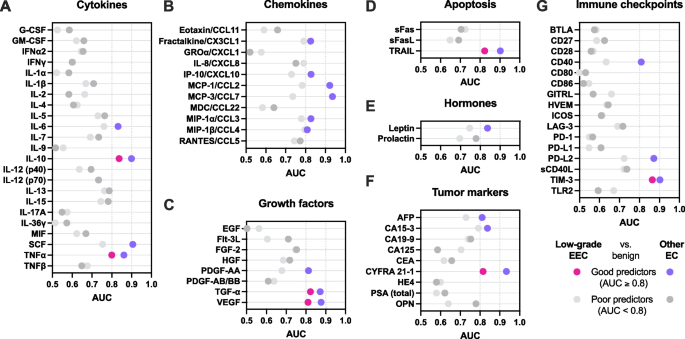 结果解读:① 54种蛋白在低级别EEC中显著升高(P=0.05~<0.0001,Supplementary Table S3);② 7种蛋白在EC中表现出良好判别能力:TIM-3(低级别EEC AUC=0.86、其他EC AUC=0.90)、IL-10(AUC=0.84/0.90)、TRAIL(AUC=0.82/0.90)、TGF-α(AUC=0.82/0.87)、CYFRA21-1(AUC=0.82/0.93)、VEGF(AUC=0.81/0.88)、TNFα(AUC=0.80/0.86)(图3)。