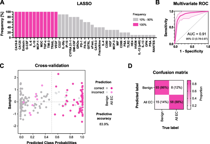 筛选/验证逻辑:① 基于CVL样本的全局蛋白谱分析(PCA、层次聚类),确定EC与良性疾病的差异谱;② 单变量ROC筛选AUC≥0.8的蛋白;③ LASSO+机器学习构建多标志物组合,验证其诊断性能;④ 关联蛋白与肿瘤特征,探索预后价值。