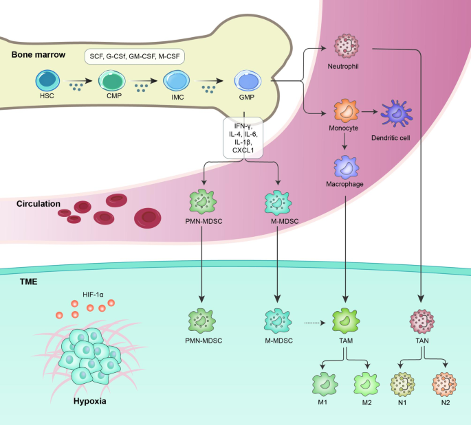 方法细节:综合1970年代至今的经典研究及最新文献,总结MDSCs的来源(造血干细胞分化受阻)、亚群分类(PMN-MDSCs、M-MDSCs等)、表型标志物(小鼠与人类的差异),以及“两步模型”的调控因子——生长因子(如G-CSF、GM-CSF)介导扩增,促炎细胞因子(如IL-6、IFN-γ)介导激活。
