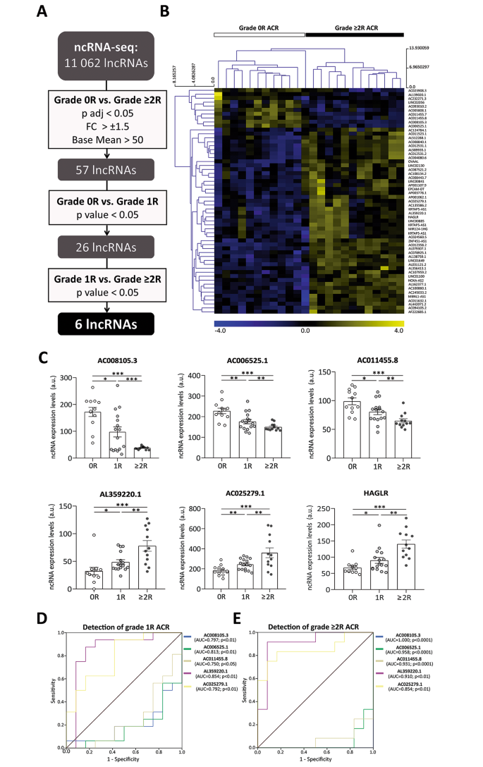 通过设定筛选标准( Fold change≥1.5、调整后p值<0.05),从11062个lncRNA中筛选出57个候选lncRNA。进一步的分层分析发现,其中6个lncRNA(AC008105.3、AC006525.1、AC011455.8、AL359220.1、AC025279.1、HAGLR)在不同ACR等级间呈现统计学差异表达(p<0.05)。例如,AL359220.1在≥2R组的表达量较0R组显著上调( Fold change=2.1,p<0.01),且其表达水平随排斥严重程度(0R→1R→≥2R)呈梯度升高趋势。