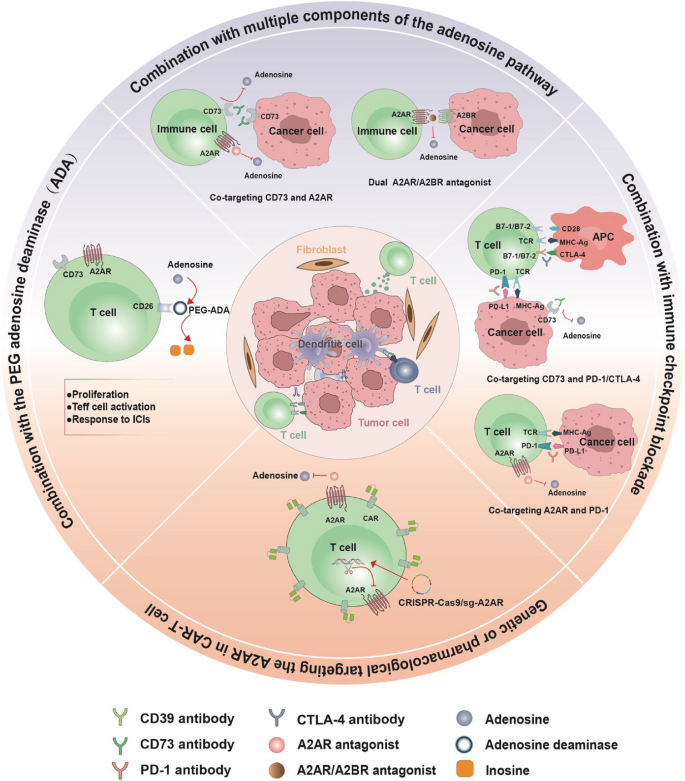 - 关键结论:腺苷通路是TME中重要的免疫抑制机制,CD39/CD73轴是eADO生成的主要途径,A2AR/A2BR是介导免疫抑制的核心受体;靶向腺苷通路的药物(如CD73单抗oleclumab、A2AR拮抗剂AZD4635)在临床trial中显示出单药或联合免疫检查点抑制剂的疗效。
