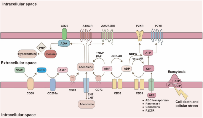方法细节:通过文献综述梳理经典CD39/CD73轴、非经典CD38/CD203a轴(缺氧条件下更活跃)、碱性磷酸酶(APs)/前列腺酸性磷酸酶(PAP)通路的生成过程,以及A1R、A2AR、A2BR、A3R的信号传导(A2AR/A2BR介导免疫抑制)。